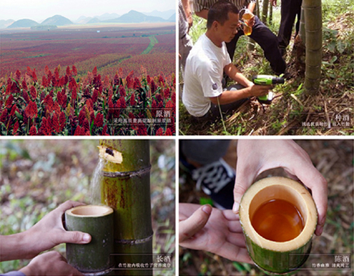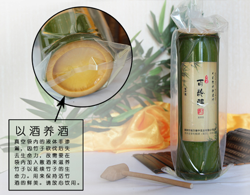 • “神奇”——百龄醉活竹酒,是选用绿色纯天然的中草药,采用独特的“窖外窖”复式发酵工艺。待清明时节再以特殊方法将其注入活竹体内,自然密封后,经竹腔内一年以上,再次发酵,使酒的醇美和竹的清香自然溶合在一起,再将竹子砍下,一款神奇会呼吸的酒就这样诞生了。一颗几十米长的活竹,只能培育出一节活竹酒。