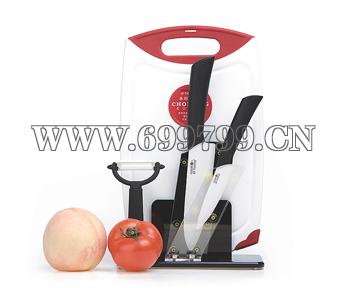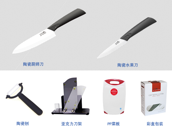 【产品描述】: 6”陶瓷厨师刀、4”陶瓷水果刀、陶瓷刨、PP菜板、亚克力刀架、彩盒包装。