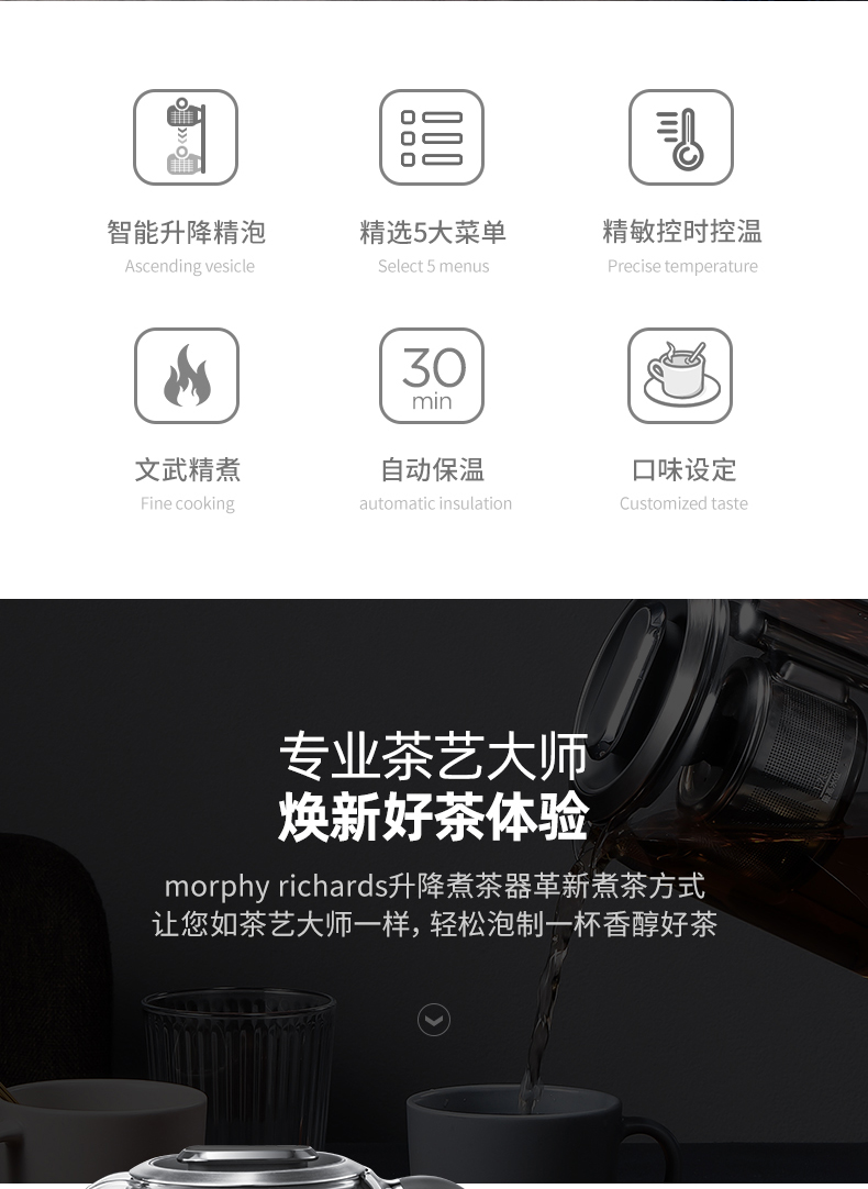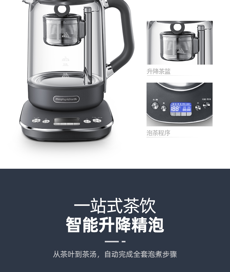 微电脑精准控温、智能升降泡茶