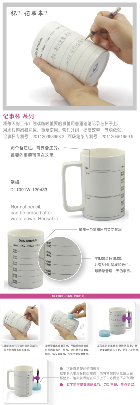 【产品提醒】:MUSKISS记事杯,只能用铅笔涂写,铅笔涂写的字迹可用沾水的海绵擦拭,也可用橡皮擦擦洗。此产品适用于微波炉、洗碗机、消毒柜等。