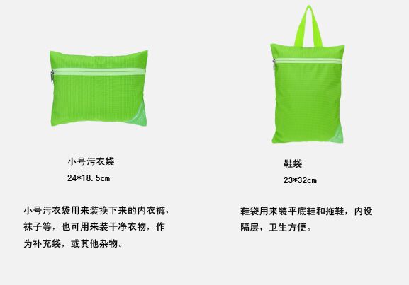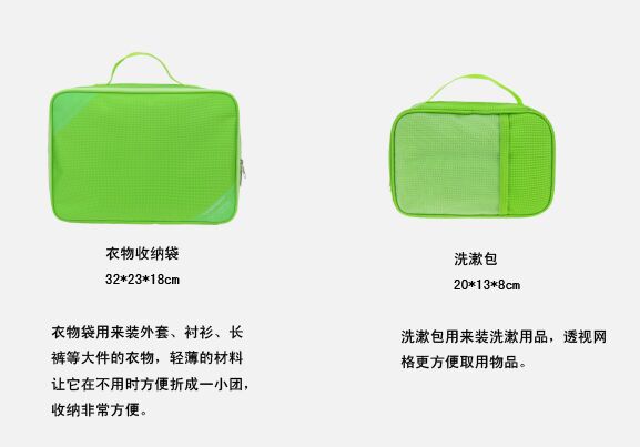 【套装配置】:衣物袋+分类衣物袋+洗漱包+鞋袋+中号污衣袋+小号污衣袋+数码配件包