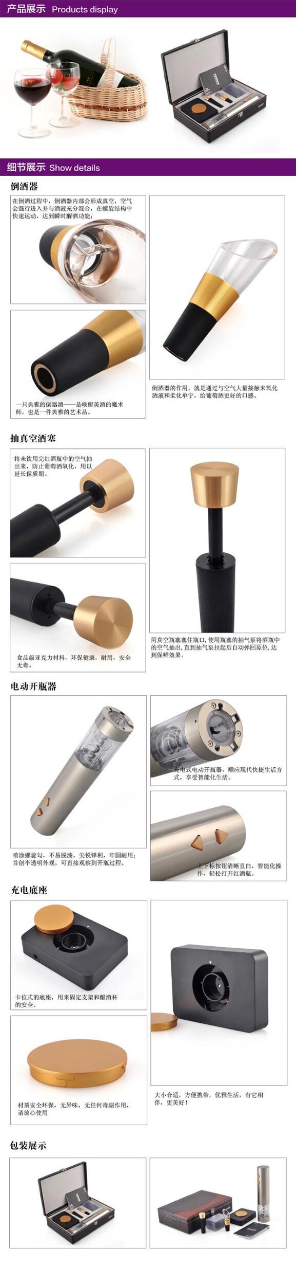 【产品配置】:电动开瓶器,倒酒器,便携式真空酒塞,充电底座,充电器.