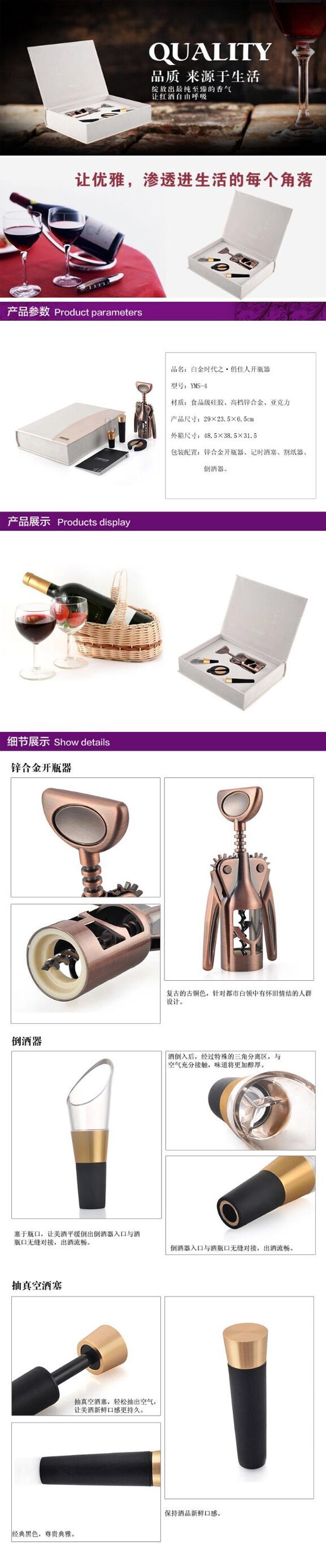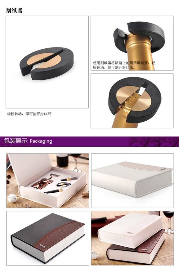 【产品配置】:锌合金开瓶器,抽真空酒塞,割纸器,倒酒
