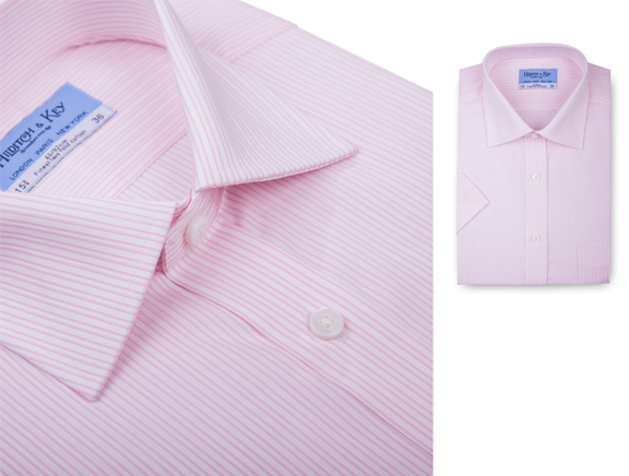 100%长绒棉,粉红色细条纹,经典八字领,白色蝶贝扣,优雅自然。