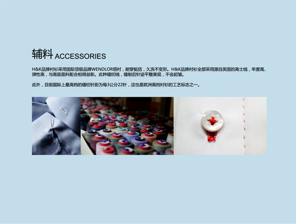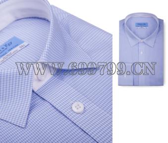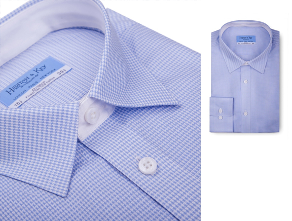 100%长绒棉,浅蓝色千鸟格面料,领座镶拼白色,贝壳扣,平袖口。细节体现品味