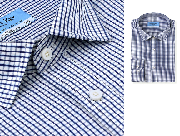 100%长绒棉,蓝灰色小格子,小方领,小斜角袖口,举手投足间展现优雅。