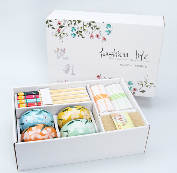 组合:手绘陶瓷碗四只、筷子四双、纯棉洗碗巾两条、韩国丝瓜洗碗海绵一块