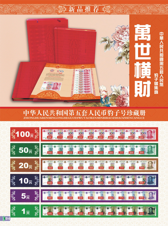 鸿运当头万事横财豹子号珍藏册册内包含:第五套人民币豹子号各面值十枚,各面值号码规律为xxxxx111—xxxxx999,前面五位数字相同。且带精制皮箱一个。