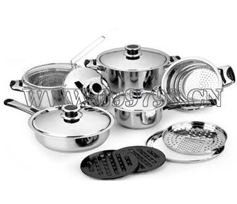 •24CM汤锅、20CM汤锅、20CM煎锅、多用蒸屉、16CM奶锅、油炸网、多用蔬菜刨、垫圈、两个高温防烫锅垫