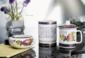产品名称: 唯雅 泰和锦上添花(三件套) 规 格: 茶杯100*140mm/笔筒100*120mm/烟缸140*60mm 材 质: 骨质瓷,景泰蓝 编 号:J2011026