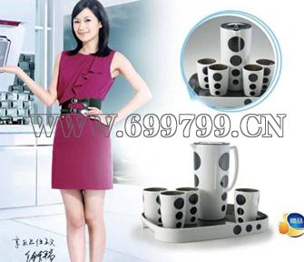 原料,安全环保,经久耐用;欧式设计风格,双层注塑工艺,透明内壁与镂空圆形外壁的完美结合使得整体线条流畅,浑然一体,典雅别致,一壶四杯,特配托盘,时尚有品味。