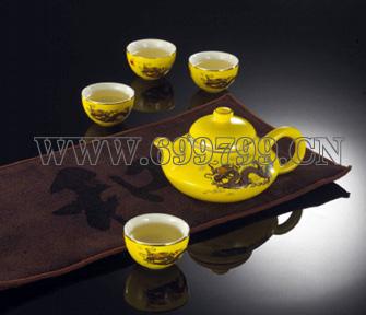 组合套件及材质 黄瓷茶壶、四个茶杯、一条茶垫