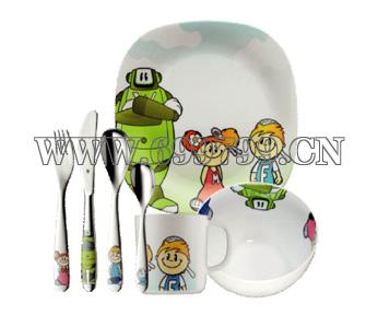 儿童餐具系列。内含不锈钢主刀、主叉、主勺、甜品勺各一把,碗、盘、杯各一个。