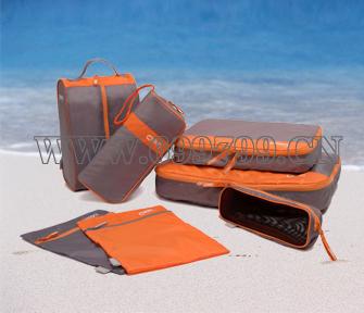 产品型号:CU0701 套装配置:大号衣物袋+小号衣物袋+内衣袋*2+立式洗漱包+鞋袋+电源线袋 花色:灰绿、灰橙、灰蓝、黑红 材质:菱形格防水涤纶