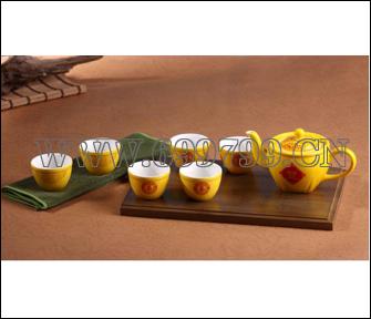 产品简介 : 产品以象征收获的金黄色为基调,用剪纸形式的五谷图案、结合农家箩筐造型茶壶,寓意五谷丰登、六畜兴旺。茶托以素描形式勾勒出中国最传统的功夫茶器皿----孟承壶与“品”字形三杯,简约之余,更隐隐展现出中国功夫茶独特的冲泡技法与茶道内涵。将浓厚的茶文化与华夏国粹工艺融为一体,充分展现了中华文化的民俗风采。