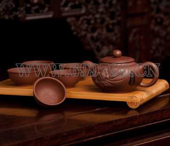 规格尺寸 :组合套件及材质 宜兴紫砂茶壶、四个内浮雕品茗杯