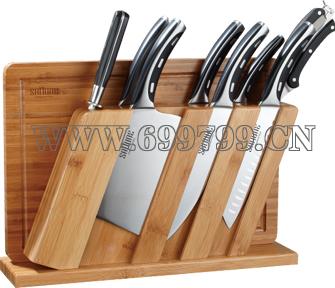 配置:砍骨刀、切菜刀、三德刀、万用刀、面包刀(冻肉刀)、 水果刀、万能剪、磨刀棒、开槽碳化竹抑菌刀架、 高强度切菜板