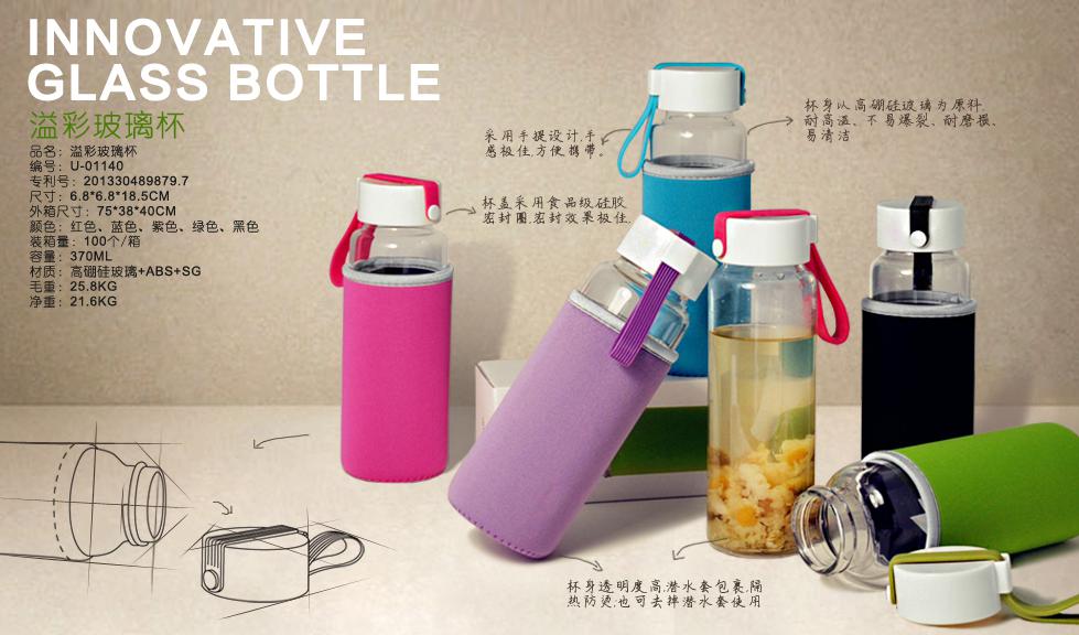 【产品简介】:创意描述:溢彩玻璃杯,采用高硼硅玻璃杯身,比普通玻璃更硬,更通透。在包上一个潜水料杯套,隔热防烫。环保 健康。