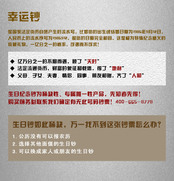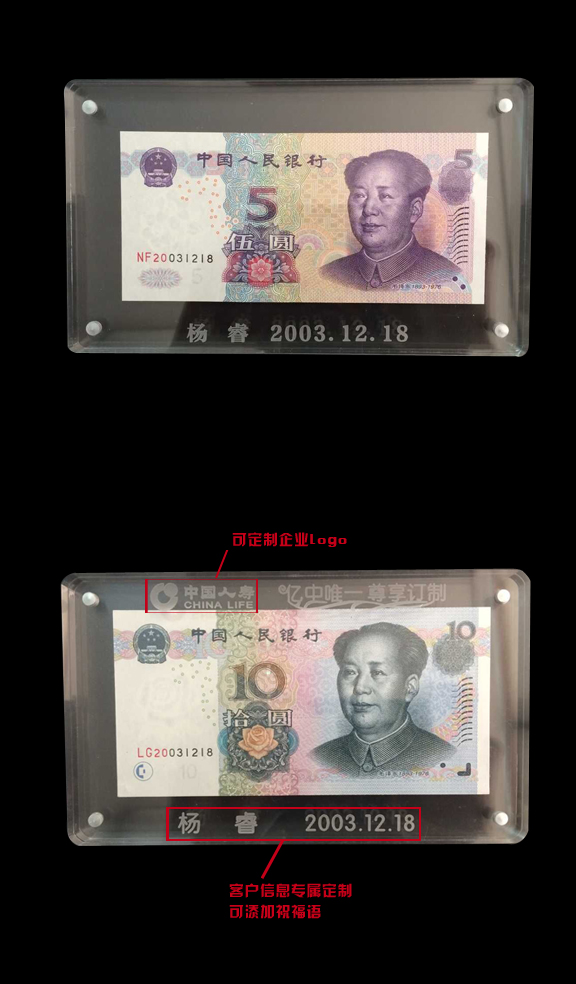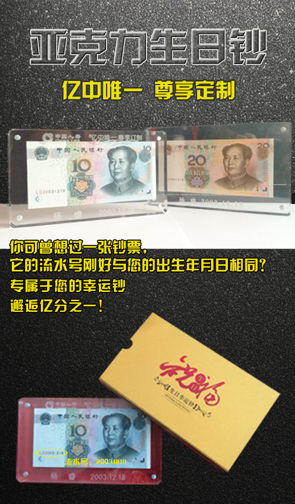 【产品特色】:为收藏者量身定做,精心挑选人民币编号与收藏者生日相同的年月日。