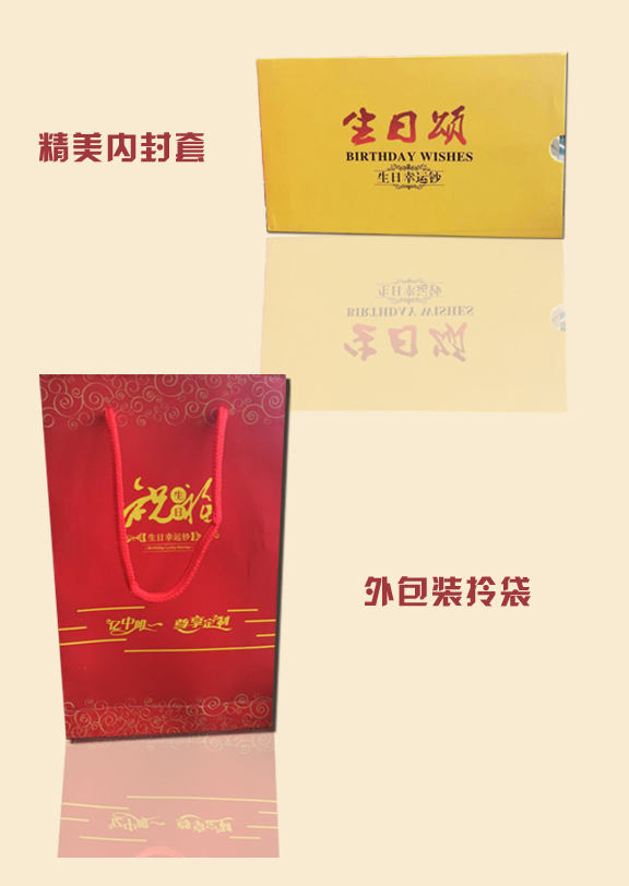 【产品包装】:亚克力+封套(黄色包装)+手提袋(红色包装)、