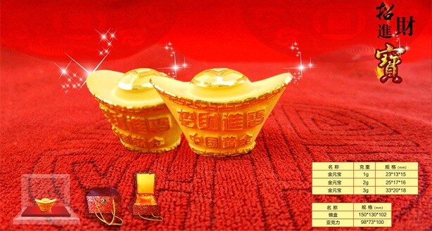 元宝原是我国特有的古钱币,用金,银诸造,其造型浑厚墩实。现在金元宝则参照古代元宝的独特造型,以花纹,配以吉语,融传统名族风格与现代审美情趣与一体。图案采用新工艺处理是花纹亮丽,更显华贵典雅。它不但具有鉴赏性纪念性、包值性永久收藏品,也是具有名族风采的馈赠海内国际贵宾高档礼品。本元宝限量定制,具有收藏价值。